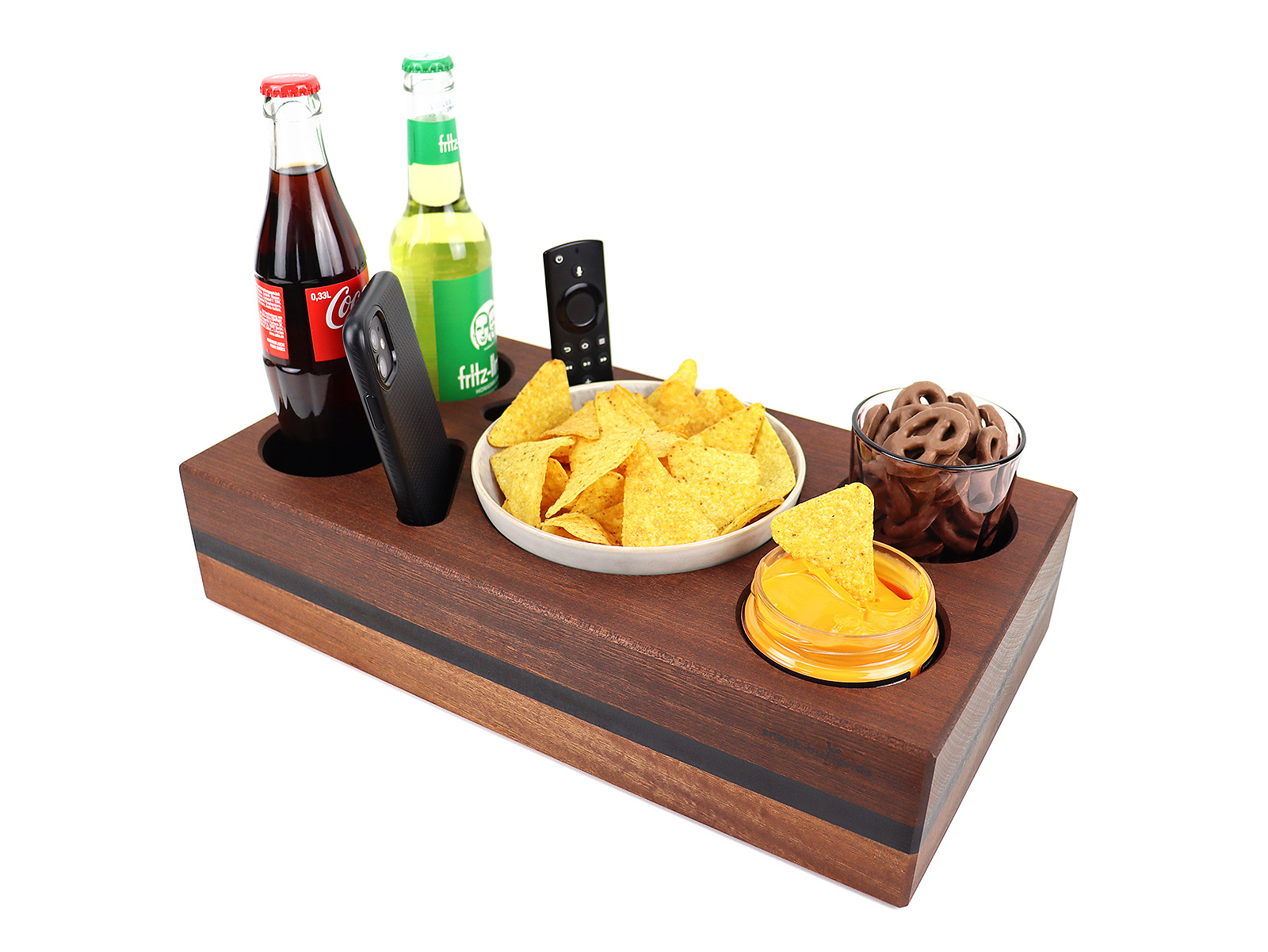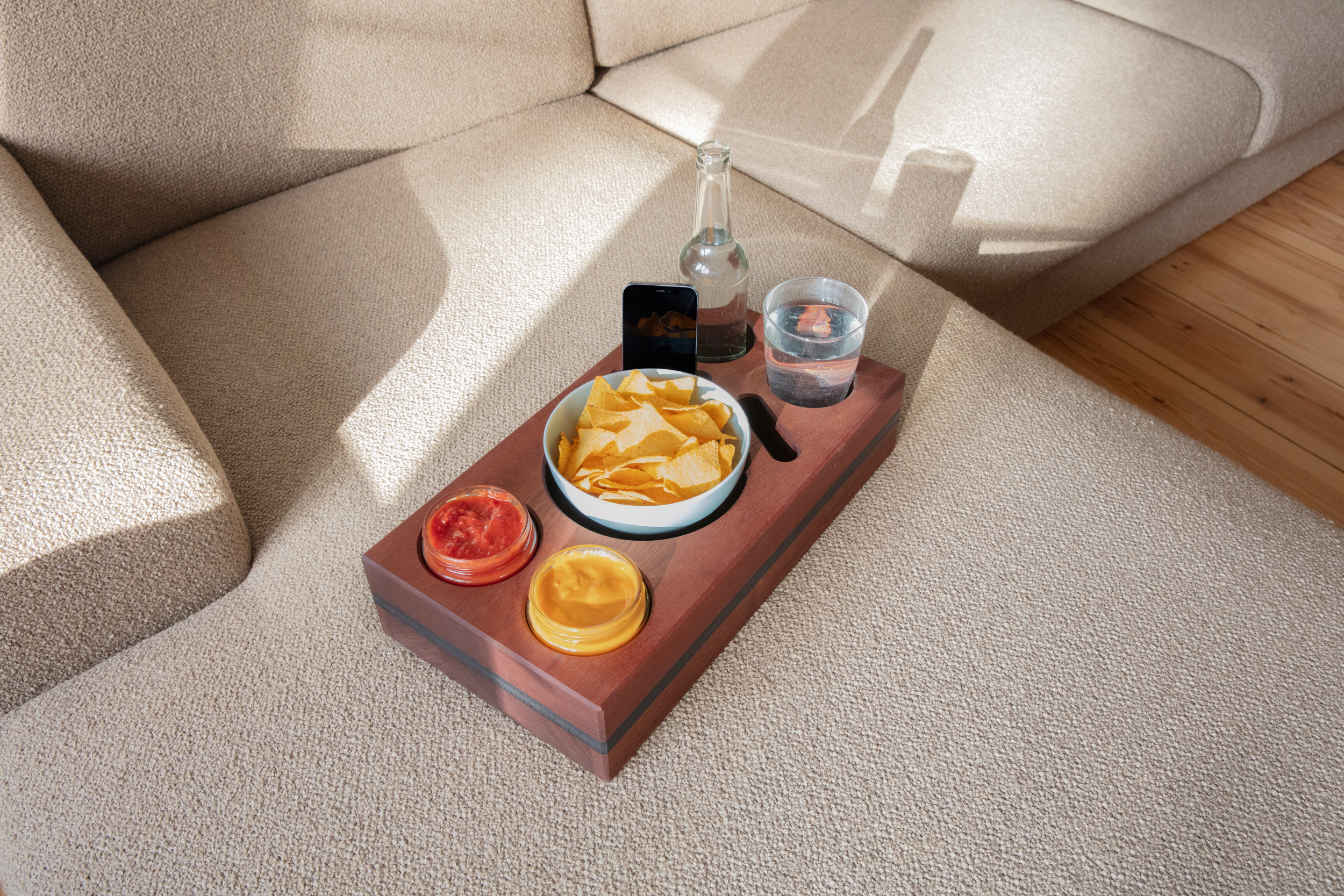 Die Schüsselbehälter des Snack-Butlers bieten großzügigen Platz mit einem Durchmesser von 16 cm und einer Tiefe von 5 cm. Der Flaschenhalter wurde speziell für Getränke konzipiert und verfügt über einen Durchmesser von 8 cm und eine Tiefe von 6 cm. Im Saucenhalter finden deine Lieblingssoßen Platz, mit einem Durchmesser von 9 cm und einer Tiefe von 4,2 cm. Die praktische Handyhalterung des Snack-Butlers ist 8 cm breit, 2 cm hoch und 5 cm tief.